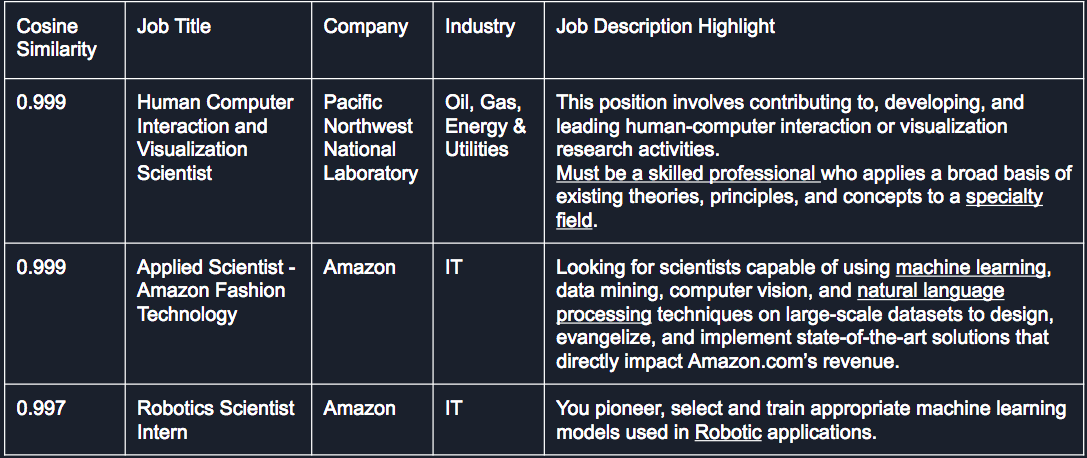 I read in my resume in plain text format, did the same text processing as the job descriptions, and then I calculated the cosine similarity between my resume and all the job descriptions. Below are the ones with top similarity scores.